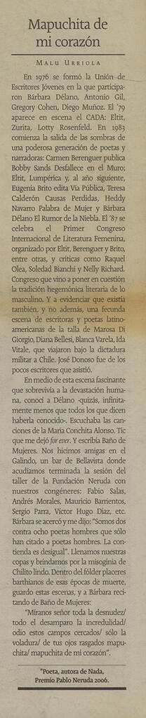Artículo "Mapuchita de mi corazón" de Malú Urriola en sección Cultura de La Tercera