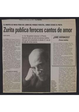 Copia digital del artículo "Zurita publica feroces cantos de amor", escrito por Javier García y publicado por Diario La Nación el 12 de enero del 2007. En este se comenta sobre la feria cultural que se realizará en el Parque Forestal a partir del martes 16 hasta el 28 de enero. Esta contará con música en vivo, cuentacuentos, teatro y presentaciones de libros, entre las que destacan los autores Rivera Letelier, Volodia Teitelboim, Pedro Engel, Óscar Bustamante y Raúl Zurita. El premio nacional de literatura 2000 presentará su último poemario, titulado "Poemas de amor".