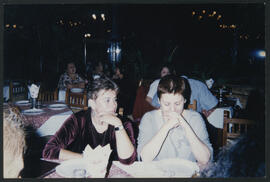 Fotografía de una cena en un restaurante, se observa a Soledad Bianchi y Diamela Eltit