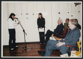 Fotografía en la que se observa a la autora leyendo un texto, presumiblemente un discurso de agradecimiento.